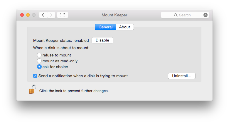 Mount Keeper is a disk mount block tool integrated in the System Preferences of Mac OS X. It detects attached disk devices such as external hard disk, flash disk or SD card, and avoid them to mount, mount them as read-only or let the admin user to choose based on preferences.
