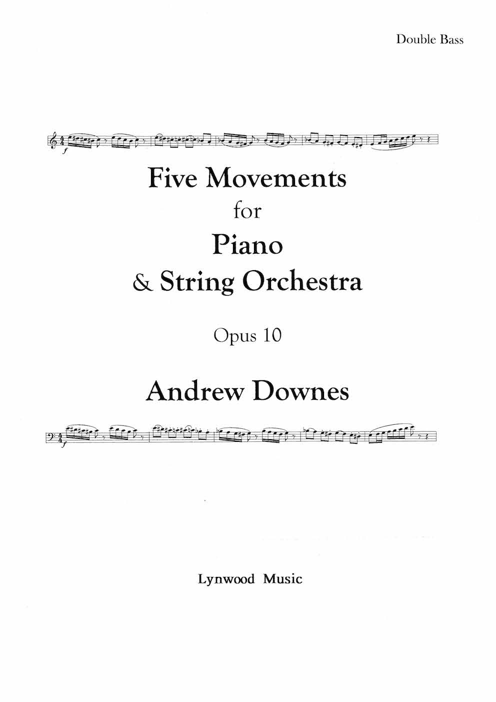 Sheet music: Double Bass part for Andrew Downes' Five Movements For Piano and String Orchestra; 8 sheets; sold with a license to print up to 2 copies