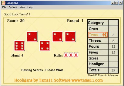 Play this simply yet very enjoyable dice game that is similar to Yachtzee. Roll the dice and select a category. Use your other two rolls to get as many of the category number as you can. If you roll a straight(Hooligan) on the first roll of the hand then you receive bonus points. If, at the end of three rolls, all five dice are showing the category number then you enter the bonus mode where big points can be scored. Score enough points and you will advance to the next round. How many rounds can you go? See if you can get enough to make it to the high score list!