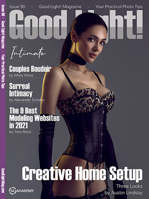Good Light! Magazine Issue 90 - Three different looks using a versatile home setup. Six tips for couples boudoir. Review of the nine best modeling websites of 2021. Inspiration from a surrealistic fine art portfolio.