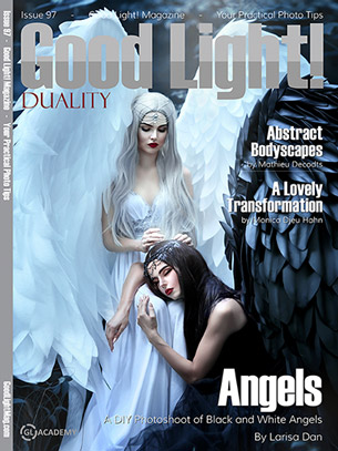 Good Light! Magazine Issue 97 - A DIY Photoshoot of black and white angels. Color theory and lighting. How styling can bring out your client’s beauty.