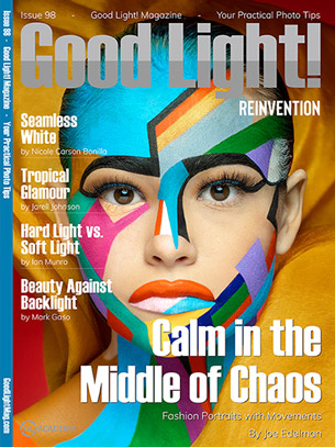 Good Light! Magazine Issue 98 - Versatile ways to incorporate movements for fashion. Controlling multiple speedlights for a high-key studio shoot. Inspiring backlight portraits with natural and indoor lighting. Getting creative with a two-light setup for glamour. Demonstrating the effects of soft lighting and hard lighting to headshots.
